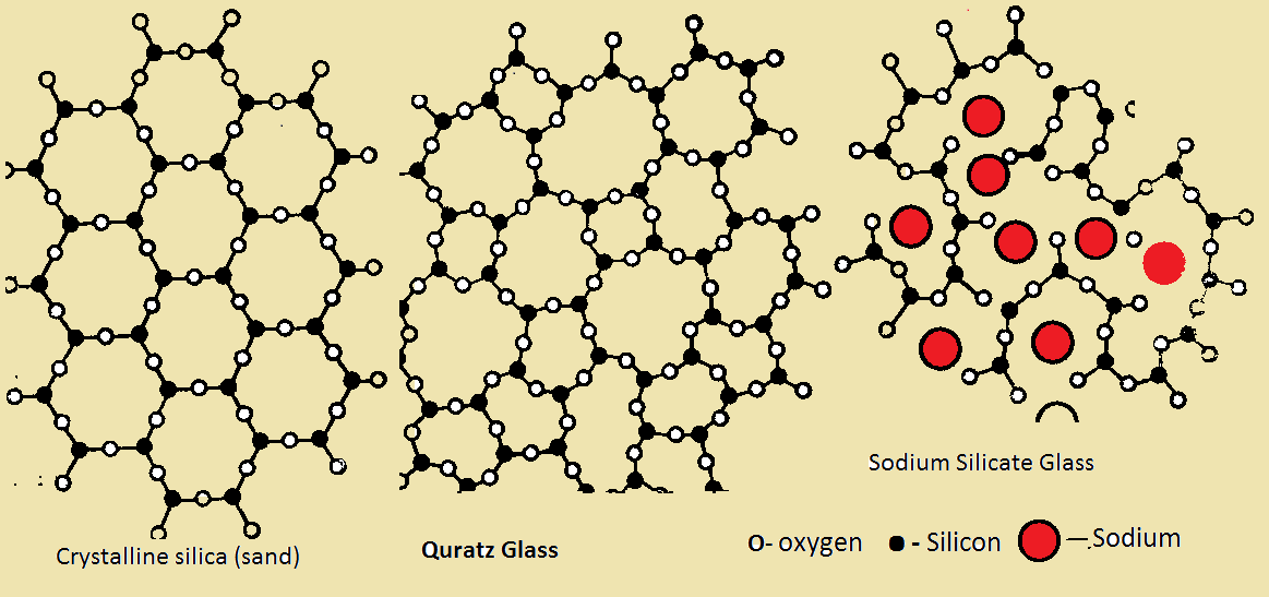 Glass: The modern definition of glass is an "amorphous solid completely lacking in long range, periodic atomic structure, and exhibit a region of glass transformation behavior", so any material formed by any technique (vapor deposition, sol-gel processing, or the melt-quenching technique), which exhibits glass transformation behavior is a glass and silica is not a required component of them. However, that glass we are used to have in our everyday life (windows, beer bottles, glasses, optical fibers in our telecommunication system, etc.) is silicate glass formed by cooling of a melt. This technology commonly uses quartz sand as a main source of SiO2 and alkaline- and alkaline earth- containing components. Homogeneous silicate melts of such composition can be obtained at temperatures around 1200 0C or more. The cooling process should be fast enough to avoid crystallization and to form transparent glass of a good quality. If the melt has a proper temperature-dependence of viscosity, the structure of the cooled glass will be similar to frozen liquid which characterized by the short range order [4].